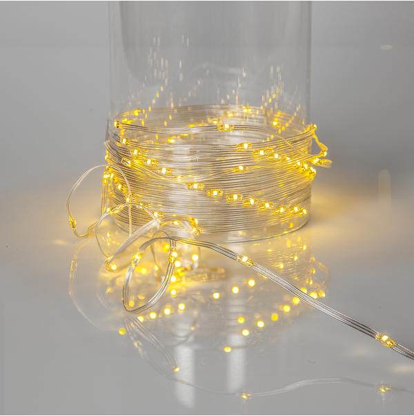 Õhuke lame valguskett väikeste valgusallikatega välitingimustesse Täiuslik ja lihtne kasutada puudel, põõsastel, trepipiiretel jne. Läbipaistev kaabel koos 480 sooja valge LED-iga, 7,5 cm vahega pirnide vahel, moodustades umbes 36 m pikkuse valgusketi.